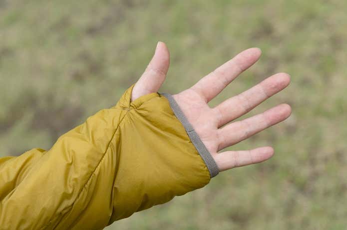 フリース製のフーディ等の行動保温着やウィンドシェルに多く装備されているサムホール。グローブ替わりに機能してくれたり、グローブの保温力をアップしてくれたり、袖がずり上がるのも防いでくれるもの。それをヒートウェーブ チタニウム フーディは装備しています。