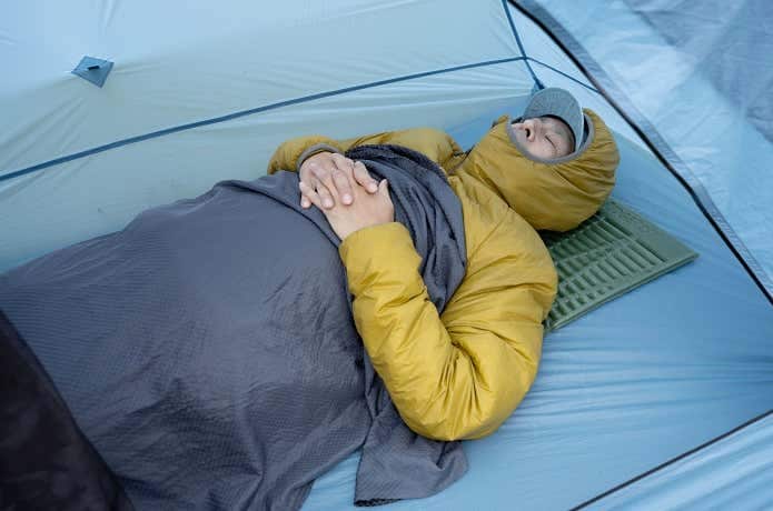 だから夏山であれば、上画像のように軽量インナーシーツ+ヒートウェーブ チタニウム フーディ&パンツの組み合わせで、寝袋不要のテント泊も可能でしょう。もちろん、気温、個人差はありますが、装備の軽量化、コンパクト化に役立ってくれそうです。