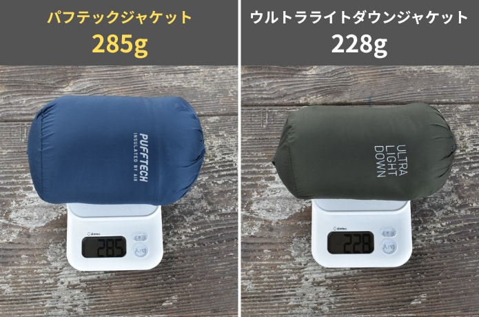 実測の重量(いずれもLサイズ、収納袋込み)は、パフテックが285g、ウルトラタイトダウンが228gと、約60gパフテックの方が重くなっています。