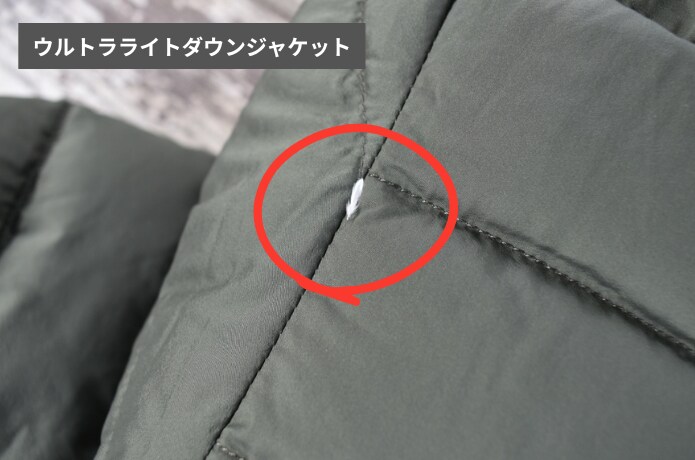 より細かく見てみると、ウルトラライトダウンでは毛抜けを発見!ダウンでは“あるある”ですが、パフテックは独自構造の化繊中綿によって、ダウンよりも飛び出しにくくなっています。