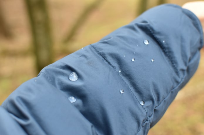 生地の表面には東レの特殊技術「NANODESIGN™(ナノデザイン)」が採用されており、繊維自体が高い撥水性を持っています。また、撥水加工もされているため、 多少の雨粒ならコロコロと弾きます。