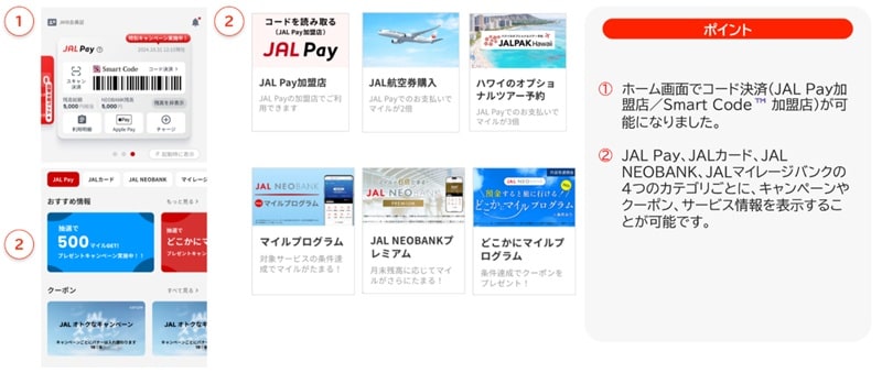 機能面では、JAL Payのコード決済がホーム画面上で可能に。利便性が向上しました。また、キャンペーン情報などもサービスごとに検索しやすくなっています。さらに、利用者からの要望を反映し、会員ステイタスの仕組みや情報を従来よりも分かりやすく表示する改善が行われました。