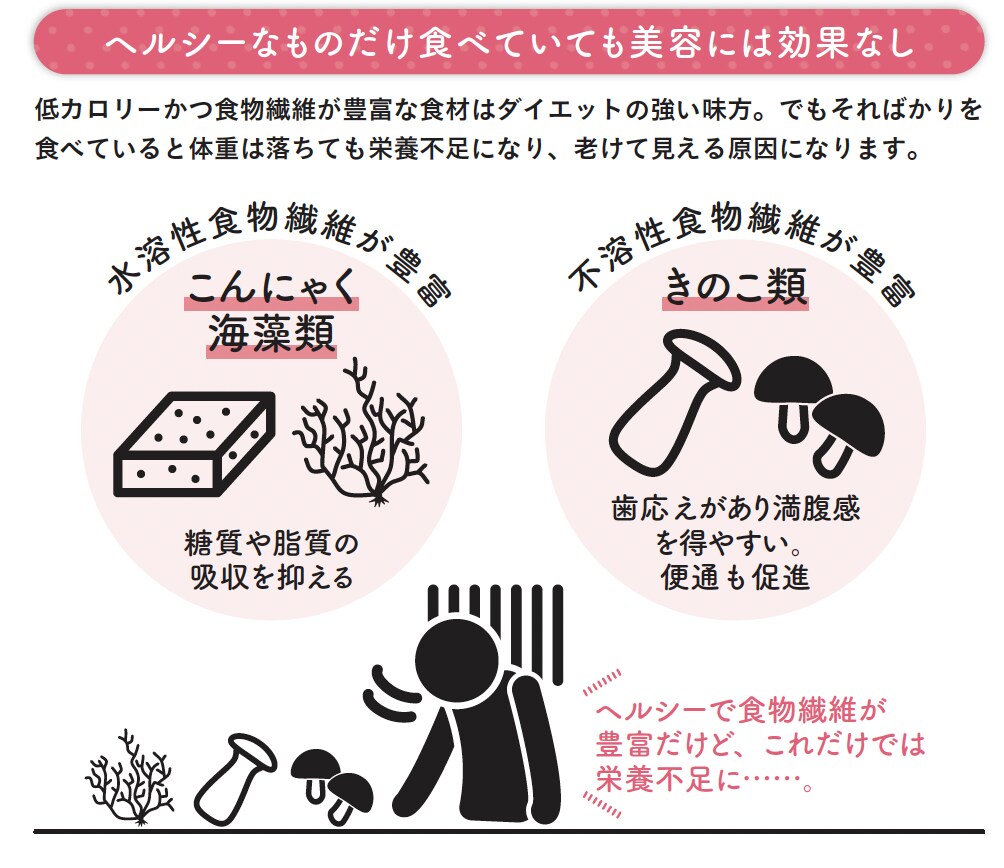 低カロリーかつ食物繊維が豊富な食材はダイエットの強い味方。でもそればかりを食べていると体重は落ちても栄養不足になり、老けて見える原因になります。