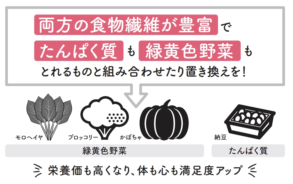 両方の植物繊維が豊富でたんぱく質も緑黄色野菜もとれるものと組み合わせたり置き換えを!