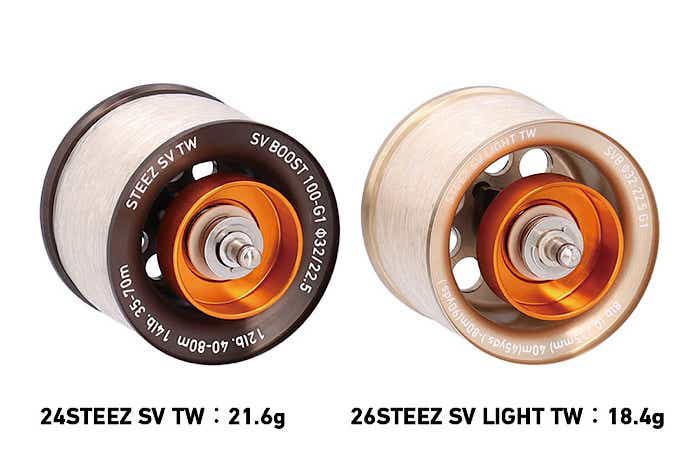 スプール径はφ32mm。24スティーズ SV TWと比べ、ラインを巻いた状態で約14.8%の軽量化と約22%の低慣性化を実現しています。