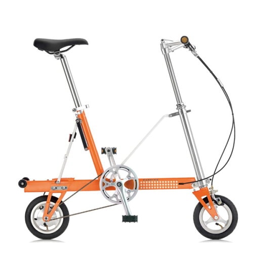 オレンジ、イエロー、グリーンなど、鮮やかなカラーがラインナップしている自転車。なんと言っても、8インチの小さなタイヤがかわいらしいですね。車体を縦型に折りたたむ珍しいデザイン。そのまま転がして持ち歩くことも可能です。