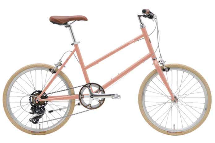 細身でスタイリッシュなフレームに、太いベージュのカラータイヤを組み合わせた1台。かわいらしい見た目と雰囲気がおしゃれなミニベロです。