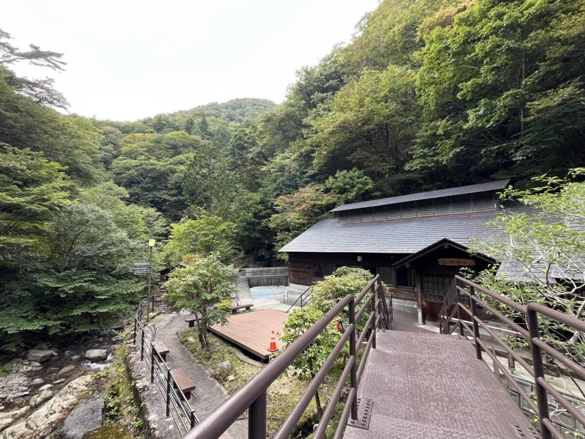 時刻は14時15分、前日、風呂ナシ雨天籠城をしていた身としてはここでお風呂に入りサッパリとして帰りたいワケで(汗)。フロントで15時で宿泊者用に切り替わりますので、と注意を受けつつ今回も離れの混浴へ。
