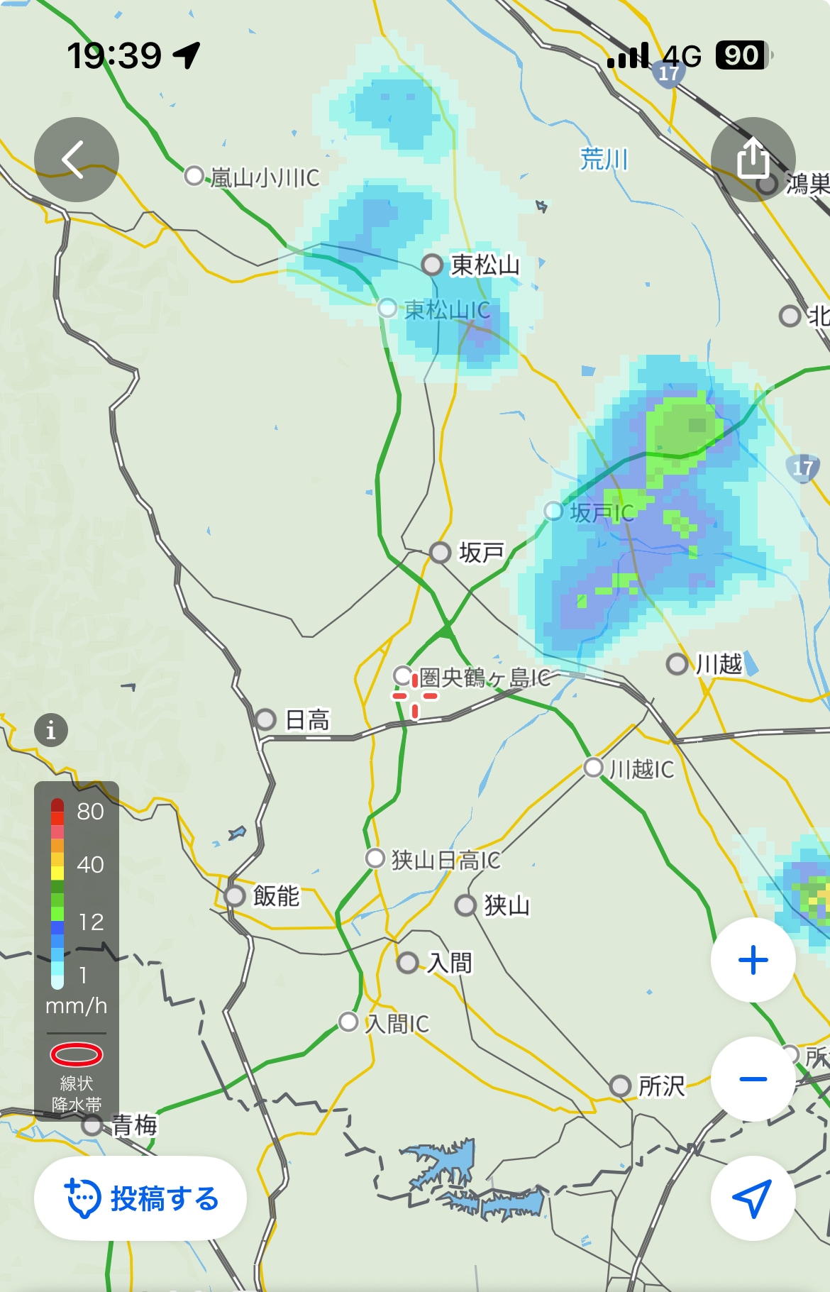 その時前方が暗いなぁと思った途端、ゲリラ豪雨に突入!そうだった、埼玉はゲリラ豪雨の巣じゃないか!せっかく温泉はいったのにいぃぃ。カッパ着てないぃぃ!