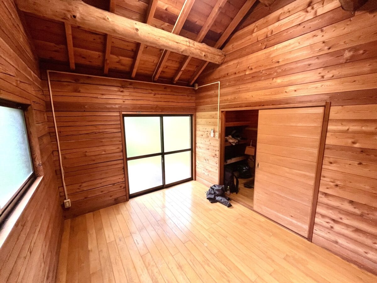 ご存じのように?ワタクシ、けっこうビビりでして、カーテンナシで外からナニモノかに覗かれたらと思うとゆっくり寝れないワケでして(汗)。ログハウスの壁の隙間にペグを軽く引っ掛け、そこにRR5958をカーテン状に掛けています。