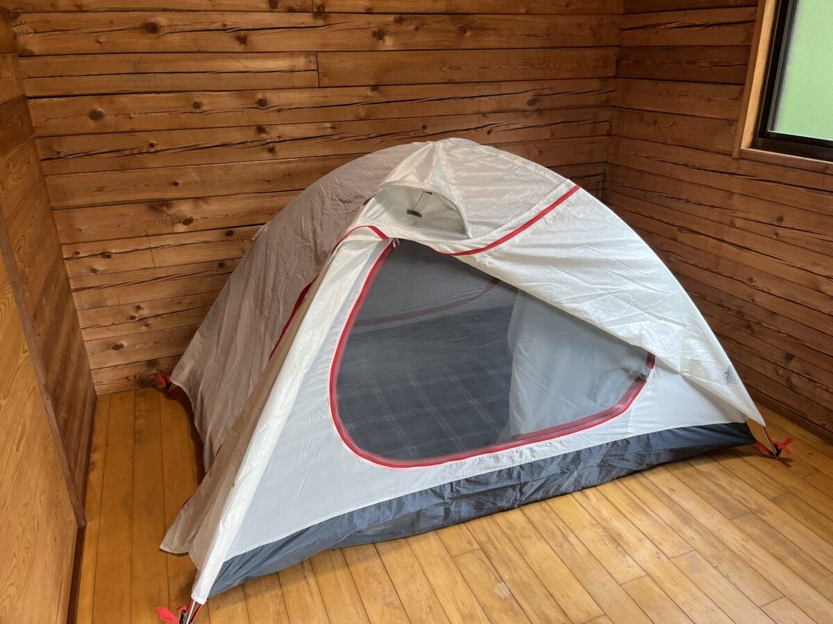 キャンプ場のご厚意により安全性の高いトイレ付バンガローへ転がり込み、早速その中にテント設営、夜露の当たらない万全の状態で、テントを乾燥させつつ休息しています。