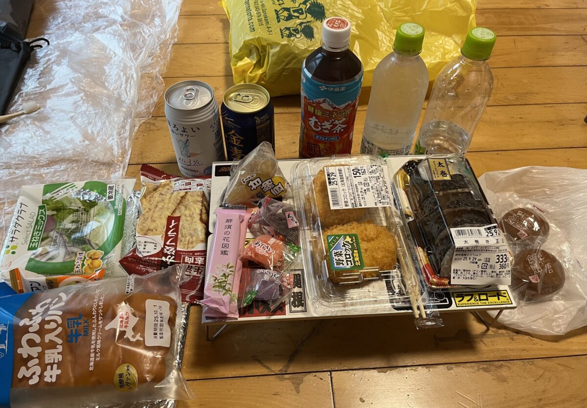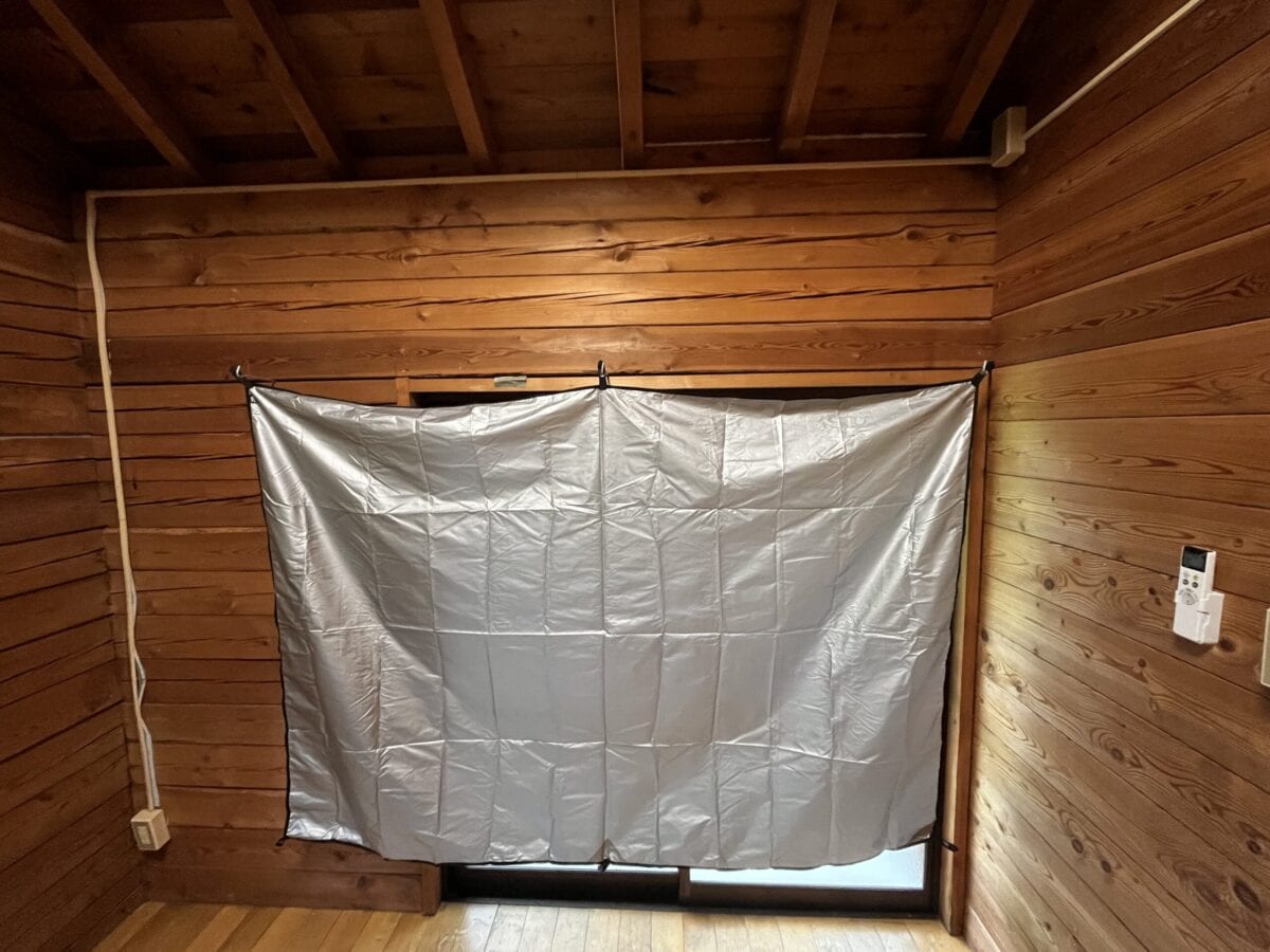 設営後、晴れ間を縫って食料を買い出し、近所の温泉も定休日なので夕方早くから籠城決定。ガラス窓もマルチフライグランドシートで目張り完了。