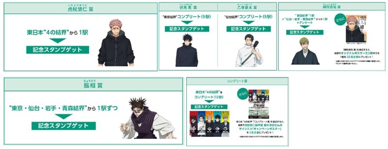 また「東京結界」から1駅と「仙台・岩手・青森結界」のうち1駅、アンケートの回答で「禪院直哉賞」として記念スタンプと抽選でオリジナルポスター(全5種のうち1種)を50名にプレゼント。全12駅獲得「コンプリート賞」達成でスペシャル記念スタンプと抽選で虎杖悠仁役の声優、榎木淳弥さんのサイン入り「キャンペーンポスター」を3名にプレゼント。