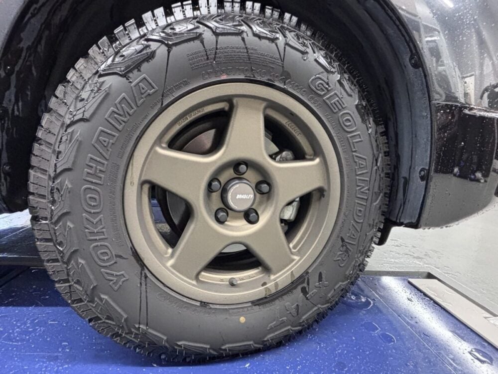 「ホイールは4×4エンジニアリングのBRADLEYです。ノーマル18インチに対して16インチに変更しています。キャンプにも使いたいのでブロックタイヤを選びました。