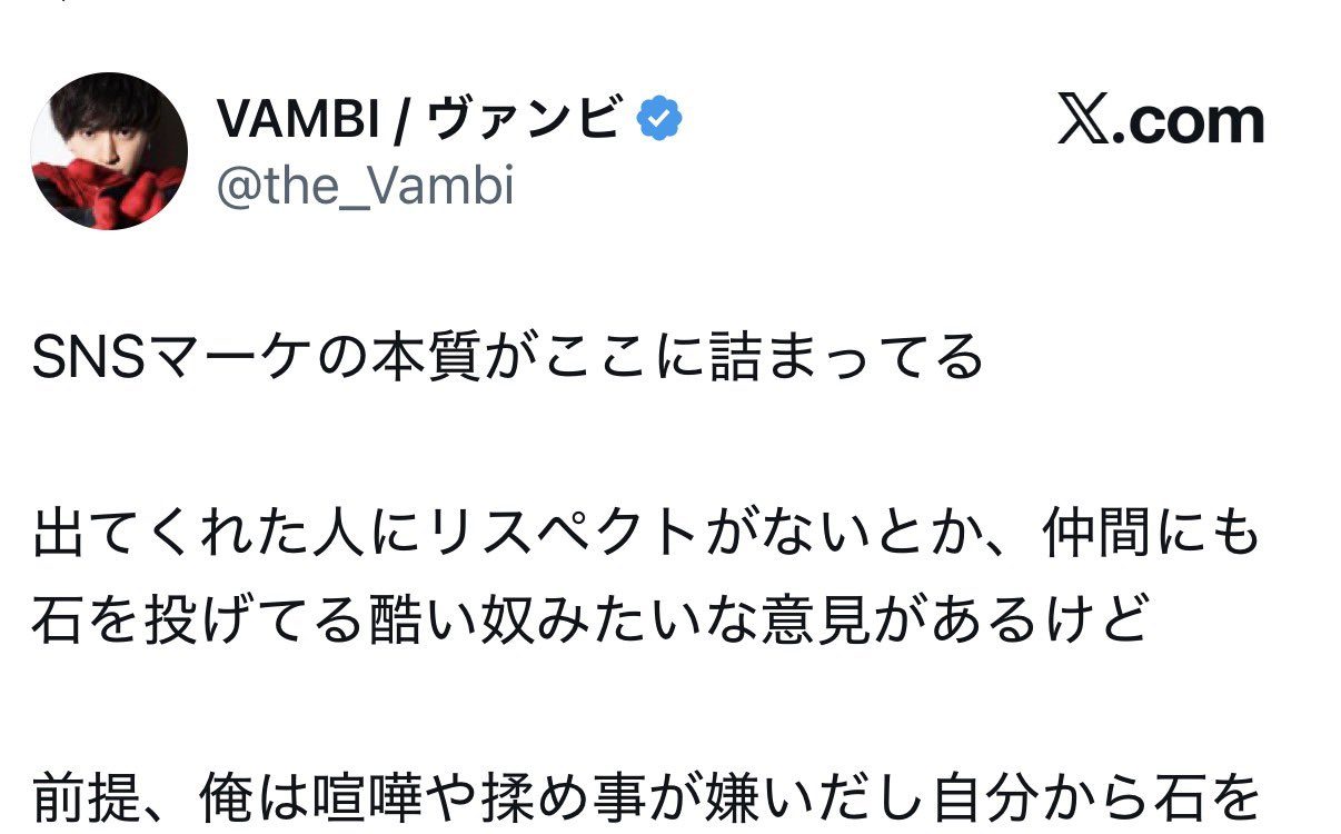 そんな中でヴァンビは12月8日に鹿乃のこのポストを引用する形でXに長文をポスト。「SNSマーケの本質がここに詰まってる」と書き出し、「今回、俺の役割は『番組の注目度を上げること』『話題に上がること』だ」「結論、それを達成する為なら自分が叩かれようが炎上しようがそれらを全うする責務がある」などと炎上商法を匂わせました。