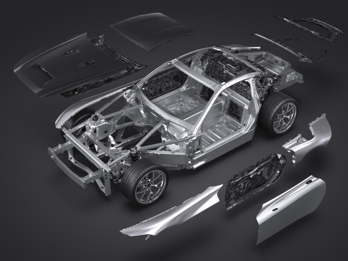 軽量・高剛性の柱となるのが、トヨタ初採用のオールアルミニウム骨格です。大型中空アルミ鋳物を骨格主要部に配置し、アルミ押出材など、最適な部材配置と接合技術で高剛性を実現しています。ボディパネルにはアルミニウムのほか、CFRPも使用しました。