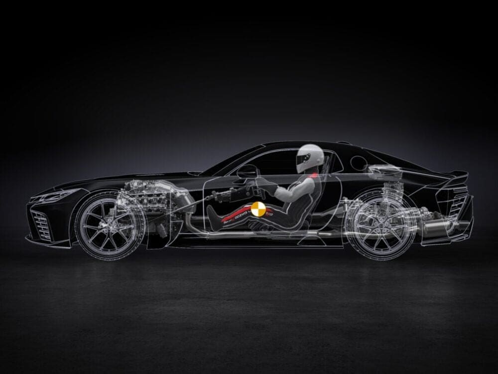 GR GTの開発にあたっては、徹底した低重心化を目指し、全高とドライバーの位置を極限まで下げようと考えることからスタートしています。駆動方式は限界領域までの扱いやすさを考え、FR(フロントエンジン・リヤドライブ)を採用しました。ドライサンプ方式を採用した4L V8ツインターボエンジンや、リヤに搭載したトランスアクスルのほか、ユニット類の最適配置によって、重量物の重心位置を大幅に引き下げました。ドライバーとクルマの重心をほぼ同じ位置にしています。クルマとドライバーの一体感と扱いやすさを高めるために理想的なドライビングポジションを追求した結果です。