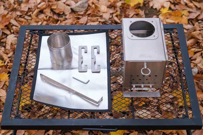 専用ケースから中身を取り出しました。本体に煙突にゴトク……そして灰かき棒と耐熱シート、六角レンチが付属していました。印象としては至れり尽くせり感があります。