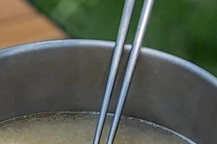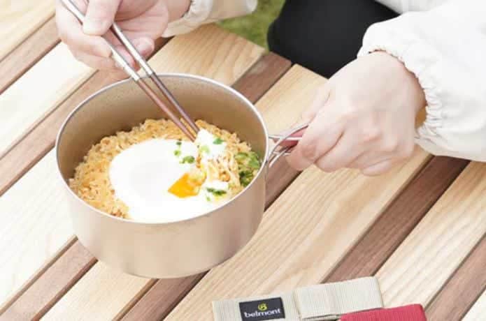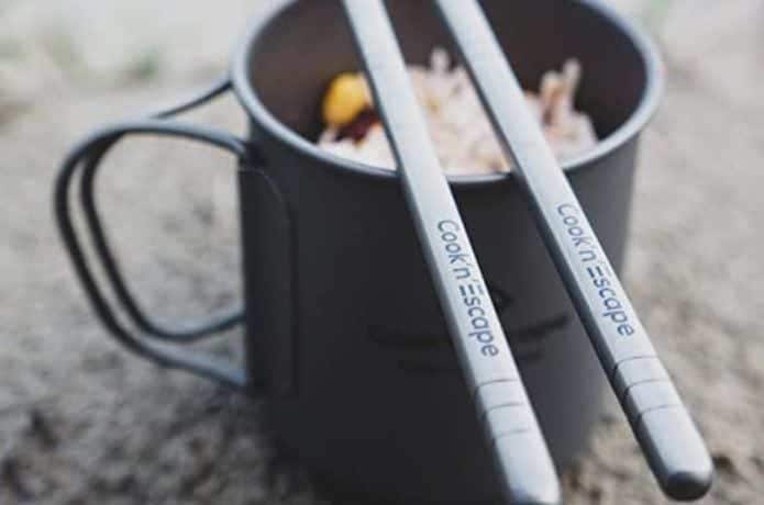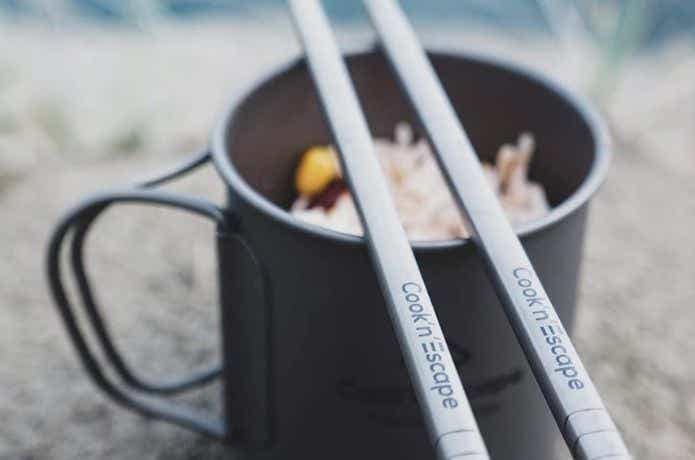 箸先に滑り止め加工があり、麺類や脂の多いメニューも食べやすくなるCOOK’N’ESCAPEの箸。軽くて耐久性の高いチタン製で、キャンプでの食事に適しています。