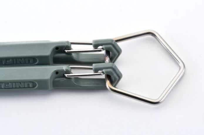 箸先にトルネード型の溝が施してあり、滑りやすいものもしっかりとつかめるように配慮されているユニフレームの「カラ箸」。持ち手の先にカラビナとリングが付いており、持ち運びや収納時にバラバラになりにくく、片方が迷子になるなどのトラブルを防げます。
