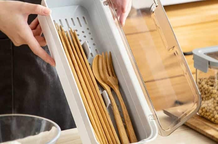 ●箸やカトラリー、食器などをすべてまとめて入れられるボックス