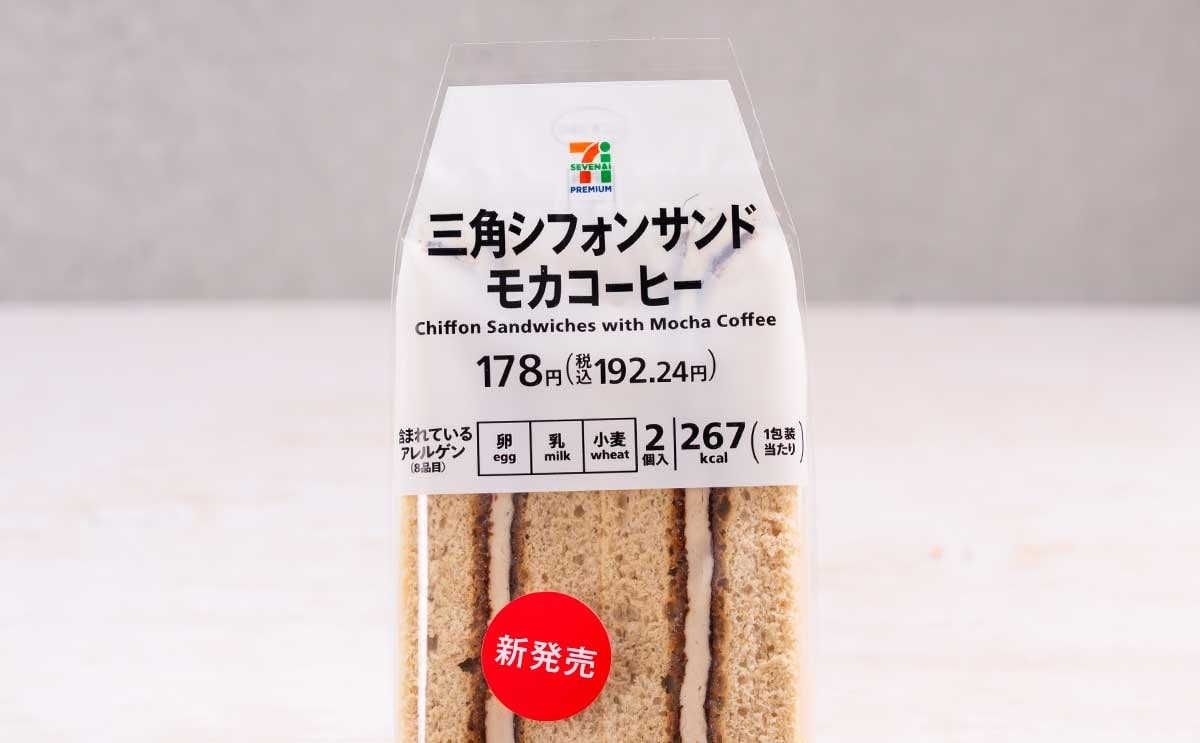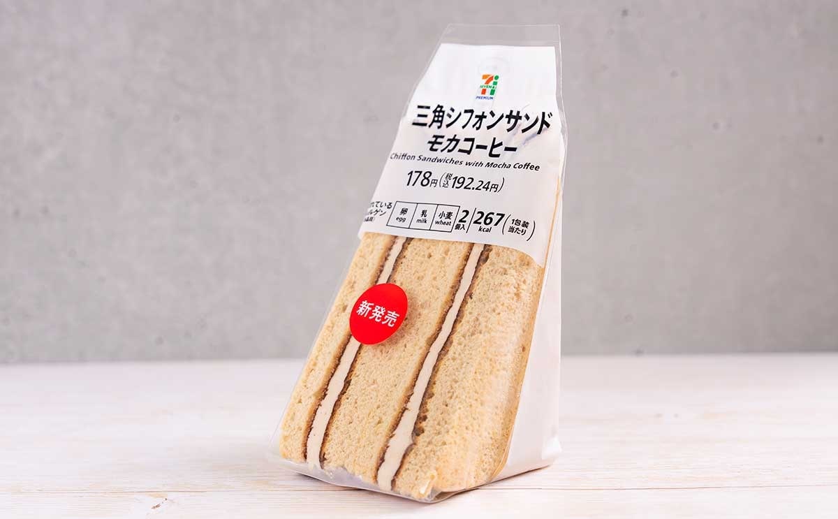 セブン-イレブンは2025年12月9日(火)に、「セブンプレミアム 三角シフォンサンド モカコーヒー 2個入」(税込192.24円)を発売しました。