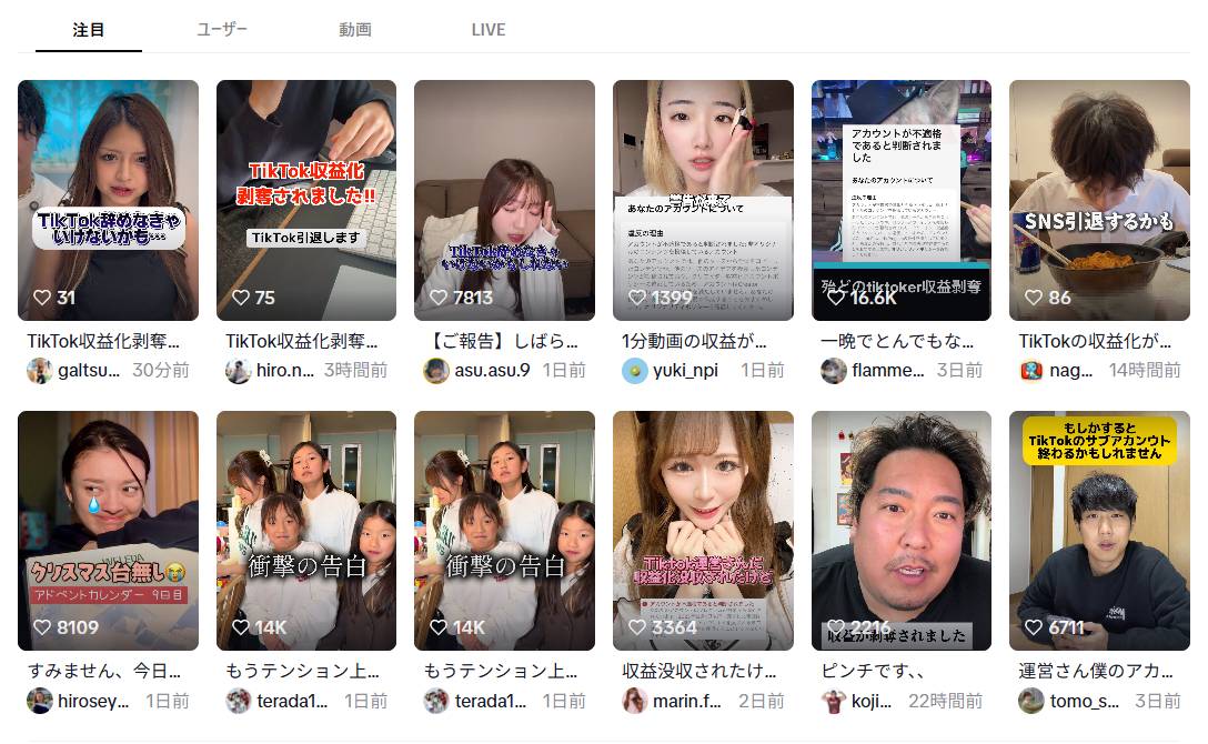 他にも、「ふらむさん」(同2万人、13万人)、「ゆりあ🇩🇪×🇯🇵」(同4万人、9万人)、「ゆきんぴ」(TikTokフォロワー数79万人)なども多数が収益化剥奪を伝えており、TikTok上で「収益化」と検索すると、多くのクリエイターがこの件を報告していることがわかります。