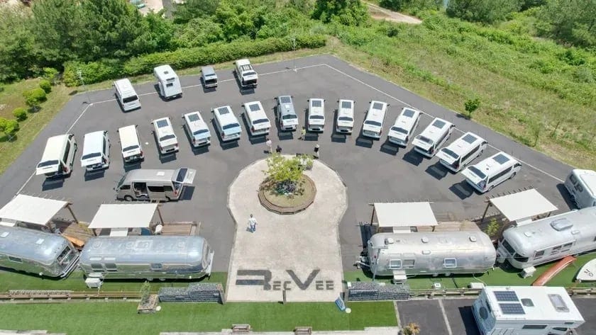 ▲ 愛知県瀬戸市にある「レクビィ ステーション」。空撮された画像で、多くのキャンピングカーが並ぶ様子がわかる。