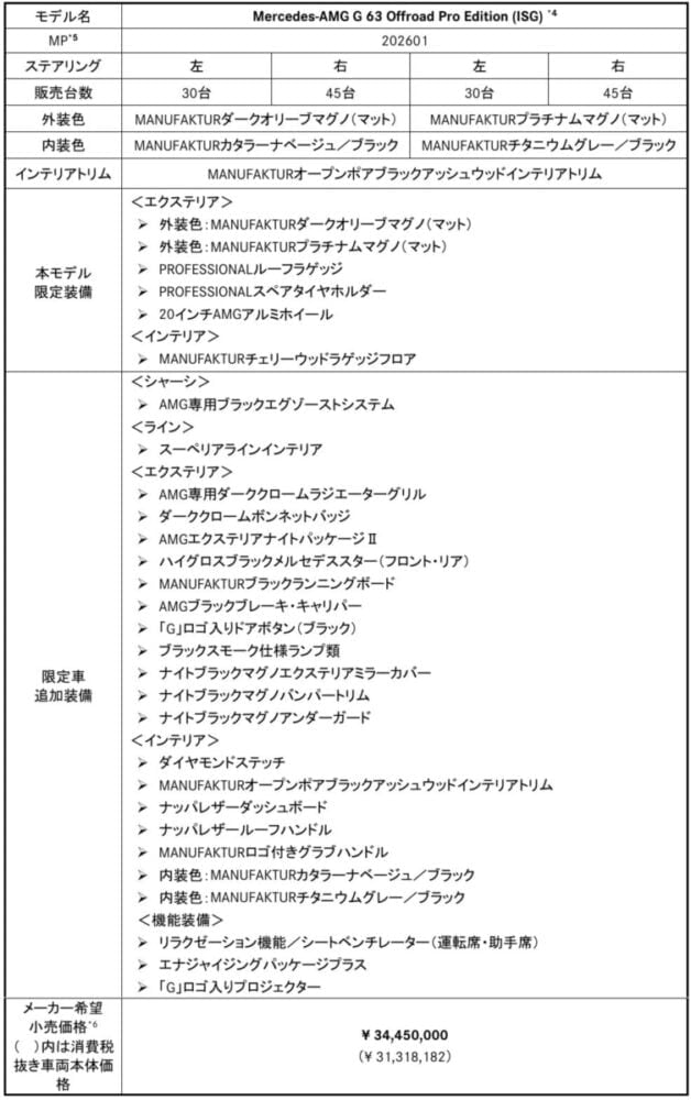 メルセデス・ベンツ日本合同会社は、「Mercedes-AMG G 63 (ISG)」をベースにした特別仕様車「G 63 Offroad Pro Edition (ISG)」を全国150台限定で発売した。