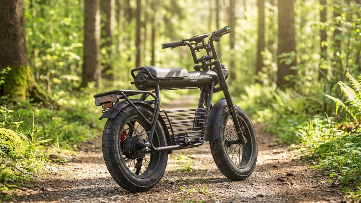 COSWHEEL MIRAI Gは、街中でひと目を引く骨太フレームと、力強く主張する4インチの極太タイヤを備えた、唯一無二の存在感を持つ特定原付電動バイク。