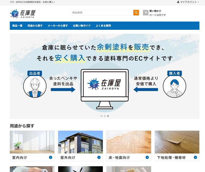 項目名:在庫屋詳細:全国の塗装業者・工務店・メーカー・DIYユーザーをダイレクトにつなぎ、余剰塗料を必要とする人へ届けるオンラインプラットフォーム。