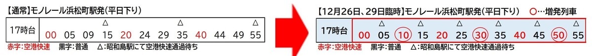 「では、その前後はどうなの?」と思ったあなた、ご安心ください。仕事納めや帰省ラッシュが予想される12月26日(金)と29日(月)は平日ダイヤでの運行ですが、空港への利便性がはかられます。