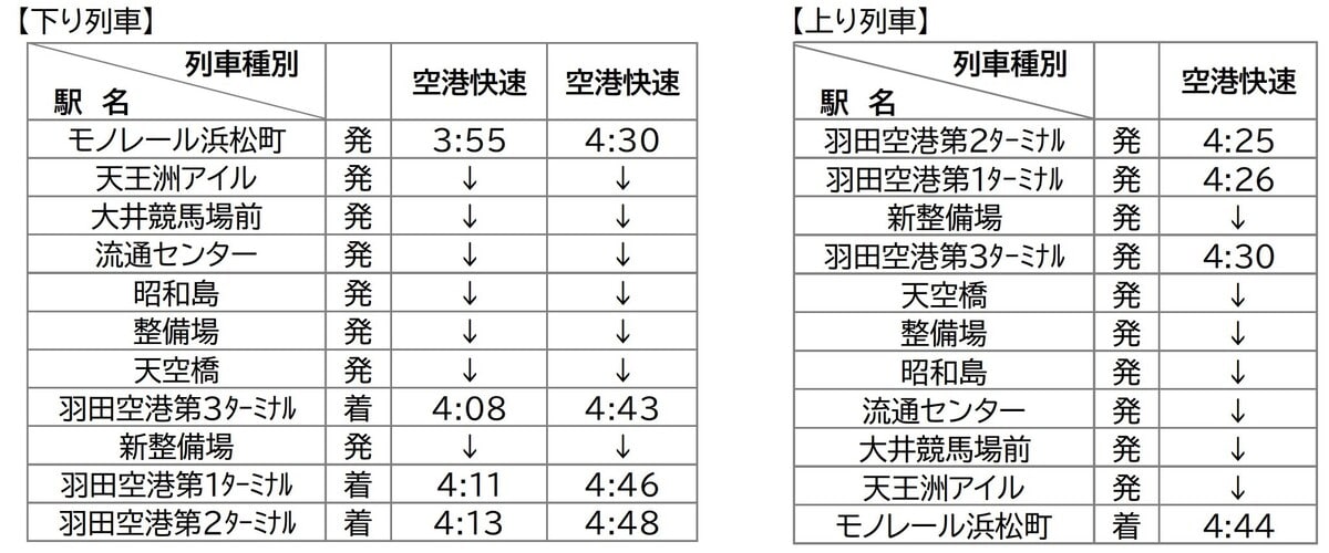 下り(浜松町発):3:55発、4:30発(いずれも空港快速)