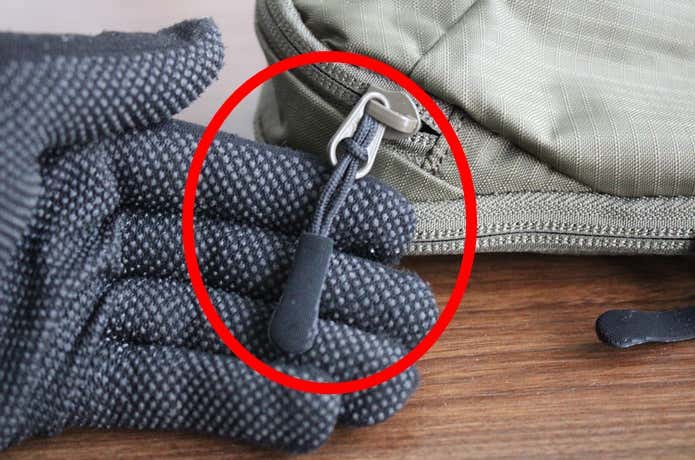 ファスナーの引手が小さいと、グローブをしていると掴みづらくてスムーズに開閉しにくいですよね。引き手にプルタブや長い紐がついていると、グローブをしたままでもスムーズに動作が行えます。