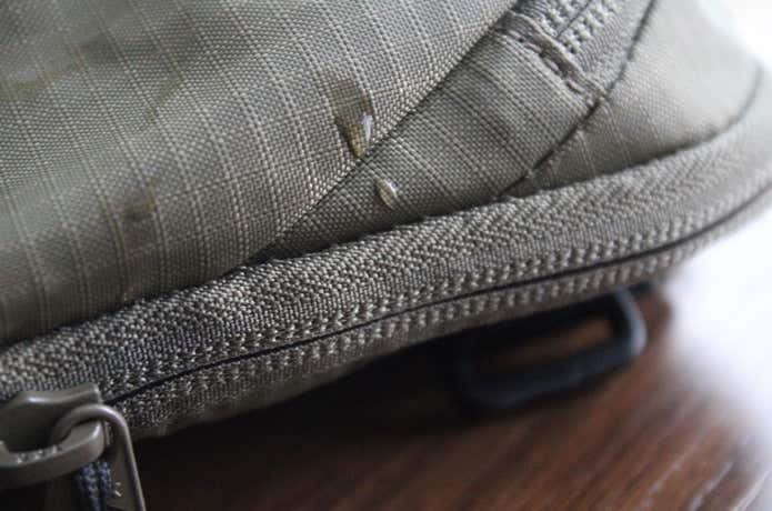 ただしあくまで「撥水」であり、防水ではないため注意が必要です。生地表面に落ちた水滴は弾きますが、生地への浸水までは防げません。またファスナーに止水処理が施されていなければ、隙間から浸水します。