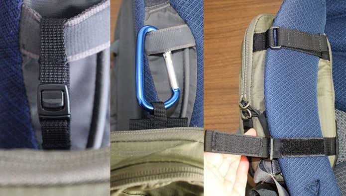 ショルダーハーネスには取り付け用ループとべロクロで装着できるため、カラビナ不要です。