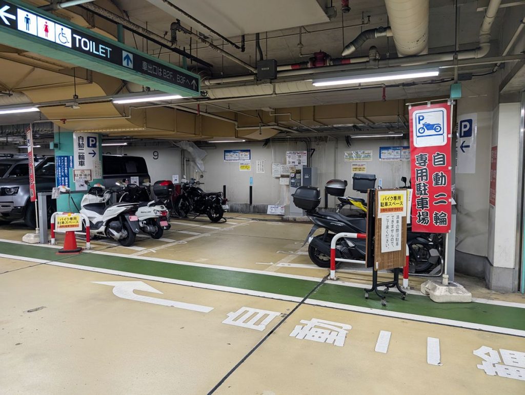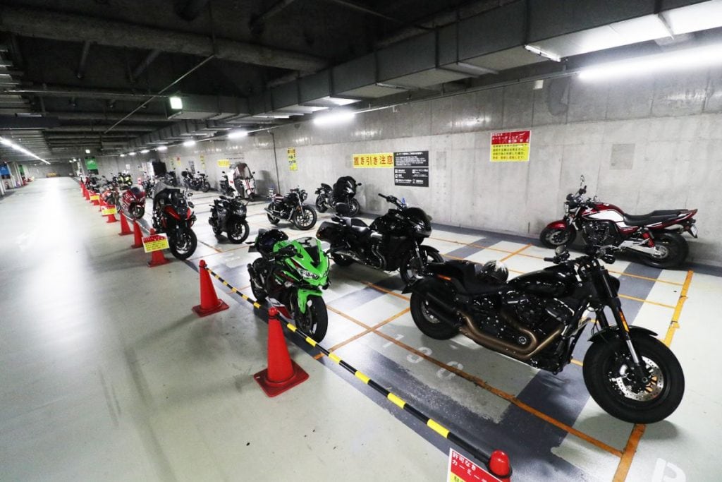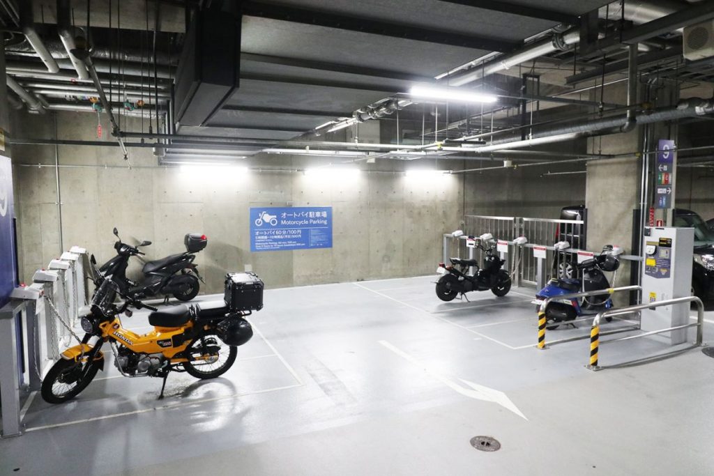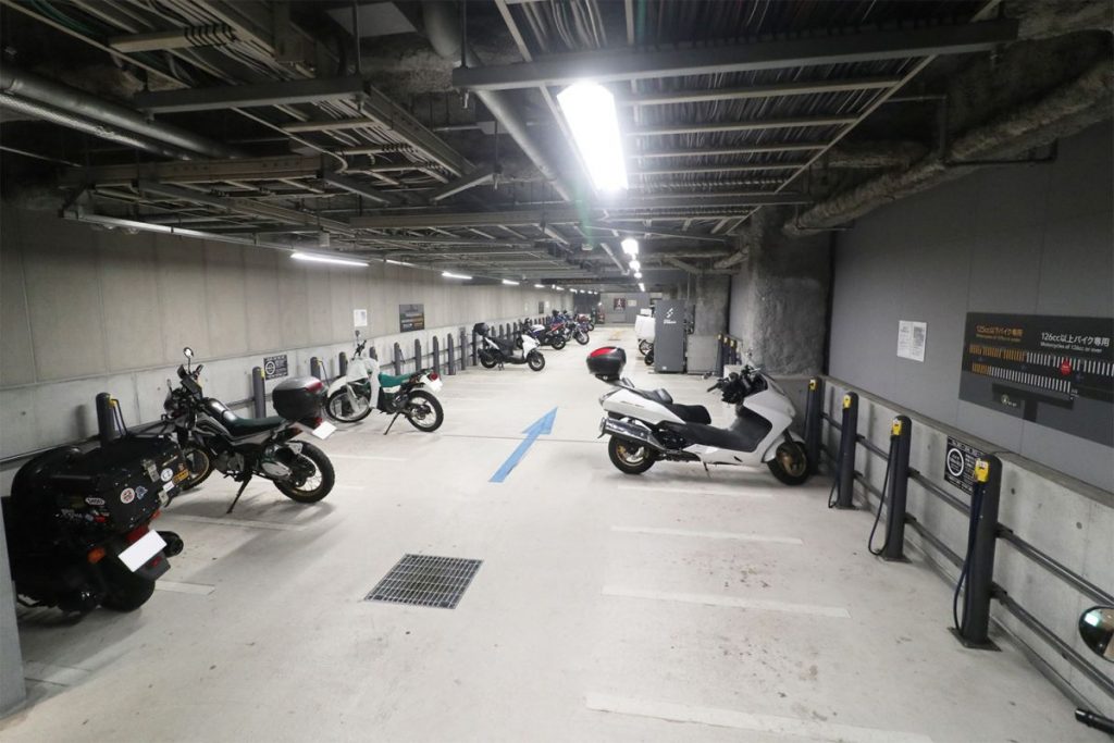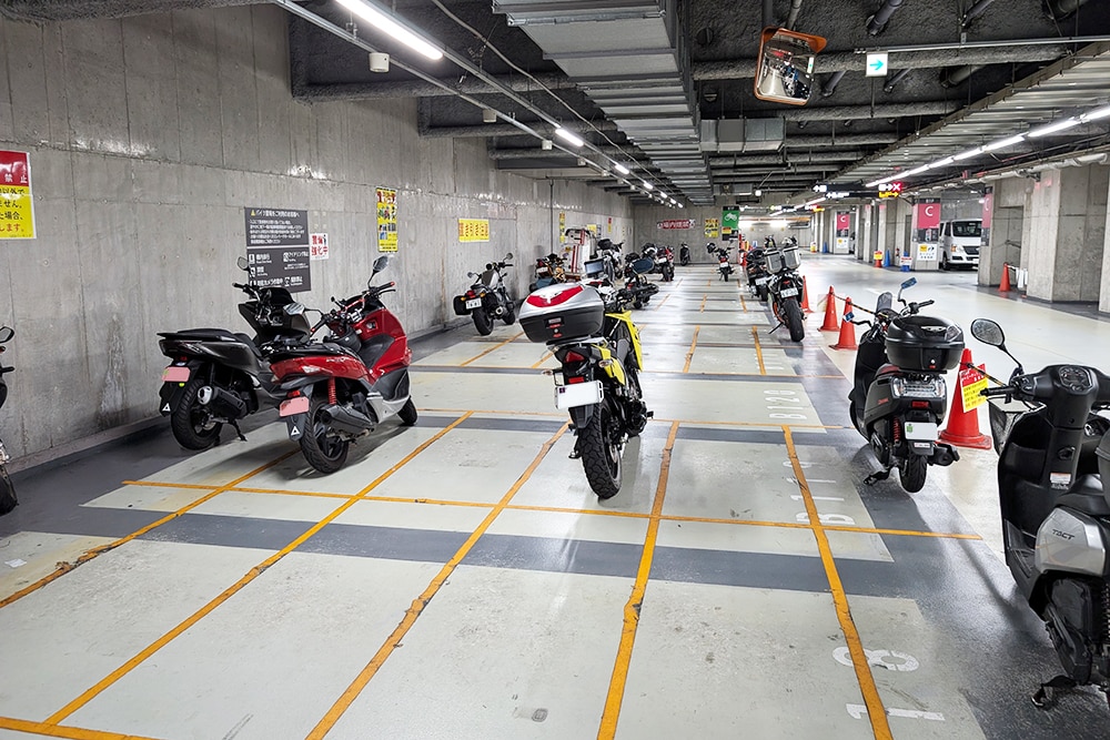 秋葉原の駅前にあり、バイクイベント『8月19日はバイクの日 HAVE A BIKE DAY』も開催される大規模複合ビルの秋葉原UDX。地下にある駐車場は、出入口のスペースも広々としている上に、ヘルメットなどの装備品を入れておけるコインロッカーもあるなど、実にライダーフレンドリーな施設と言えます。