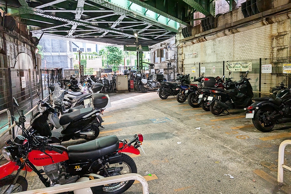 飲食店が多いことから「サラリーマンの聖地」としても知られる新橋駅の西口にあるSL広場から徒歩4分、ガード下の飲み屋街の一角にあるのが「TOKYO PUBLIC 新橋三丁目オートバイ専用駐車場」です。JRの高架下に位置した駅近という好立地で、屋外ながら雨が凌げる利便性の高い駐車場です。すぐ隣に公衆トイレがあるのも嬉しいポイント。周辺の繁華街に御用がある際はぜひご利用ください。