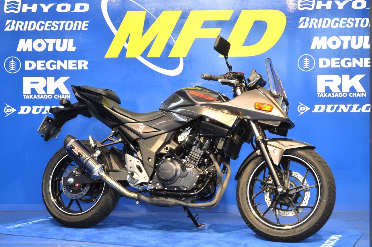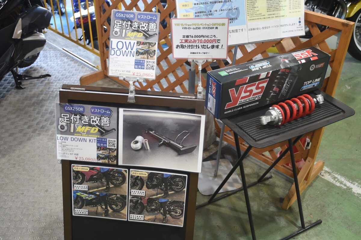 MFDモトフィールドドッカーズでは、そのKATANAをイメージしたコンプリート車両を販売中。現在、KATANA仕様車はMFD650KATANAと、GSX250RをベースにしたMFD250KATANAを販売している。コンプリートモデルだけでなく、好みのパーツを装着して自分だけのカスタムバイクに仕上げることもできる。その車両も試乗会で乗ることができるというから驚きだ。
