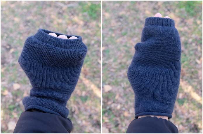 指の途中でカットされた指なし手袋では難しいですが、こんな使い方ができるのは大きな筒状になっているハンドウォーマーならではのメリット。