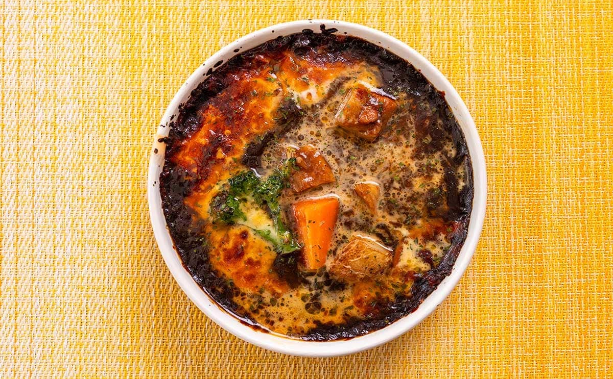 この商品は、濃厚なビーフシチューソースに、牛肉とにんじん、ブロッコリー、じゃがいも、チーズをのせて焼き上げ、仕上げにクリームソースをかけたドリアです。