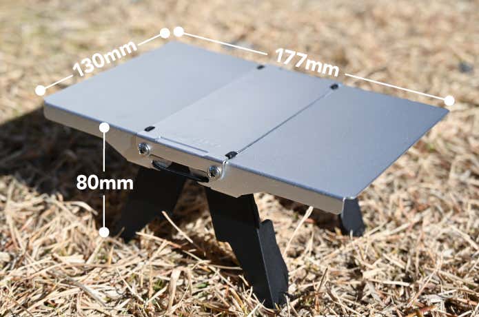展開時のサイズは幅177 × 奥行130mm×高さ80mm。天板の大きさを例えるならば、ほぼ漫画の単行本と同じです。重量135gと、ミニテーブルとしてみると標準的ですが、かなり軽量で手に持ってもほとんど重さを感じさせません。