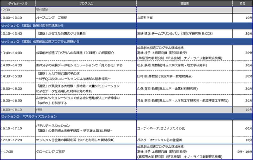 構成:政策対応利用課題から1課題の講演, 成果創出加速プログラム課題から4課題の講演, パネルディスカッション(コーディネータ:ヨビノリたくみ氏)「富岳」の最前線と未来予想図 ~研究者と語る1時間~