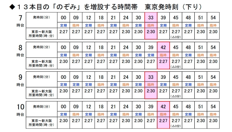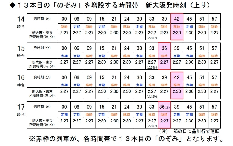 13本目の「のぞみ」を増設する時間帯は、7時~10時台(下り東京発)、14時~17時台(上り新大阪発)。なお、新大阪駅17時台に設定された13本目の臨時「のぞみ」は品川行きで運転する場合があります。