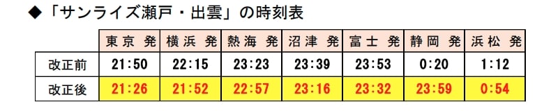東京駅出発後は、横浜駅21時52分発、熱海駅22時57分発、沼津駅23時16分発、富士駅23時32分発、静岡駅23時59分発、浜松駅0時54分発にそれぞれ変更。浜松駅から先の時刻に変更はありません。
