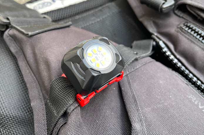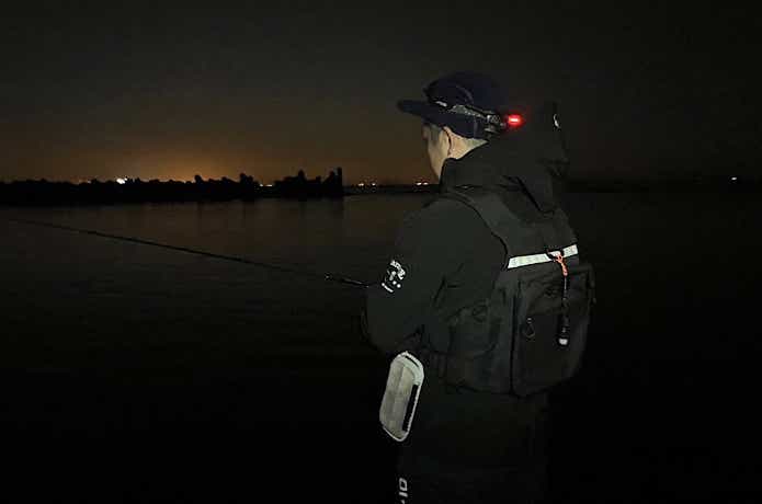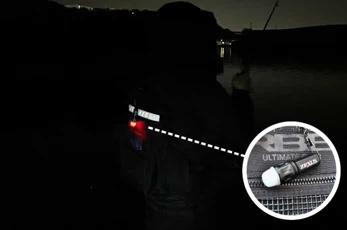 ヘッドライトとは別に、ウェーディングなど暗所での釣りでは、自分の存在を周囲に知らせるためのライト(フラッシャー)を背中に装着するのも有効です。