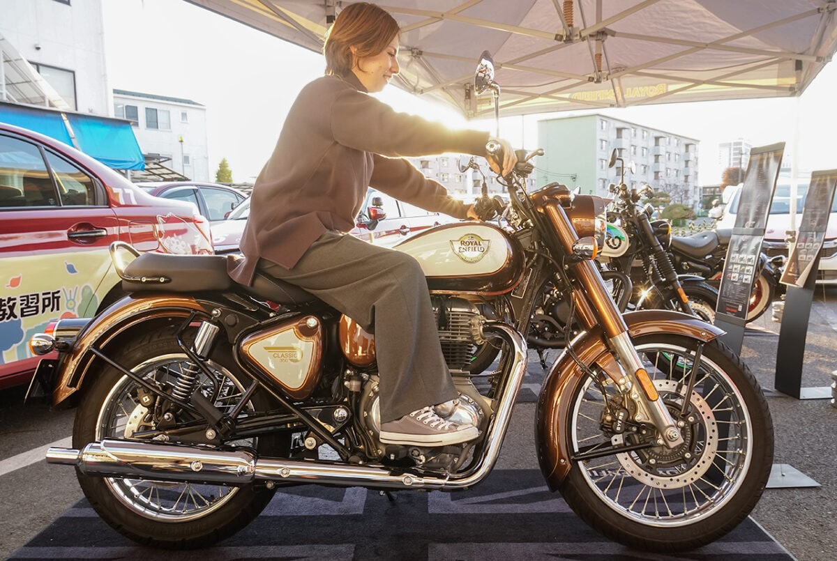 普通自動車免許を取得中のゆいさんは、人生にバイクのバの字もなかったというが、ロイヤルエンフィールドの跨りイベントに「カッコいい」と参加してくれた。