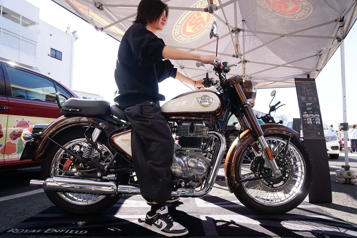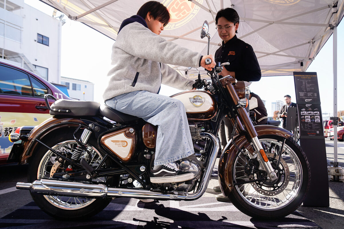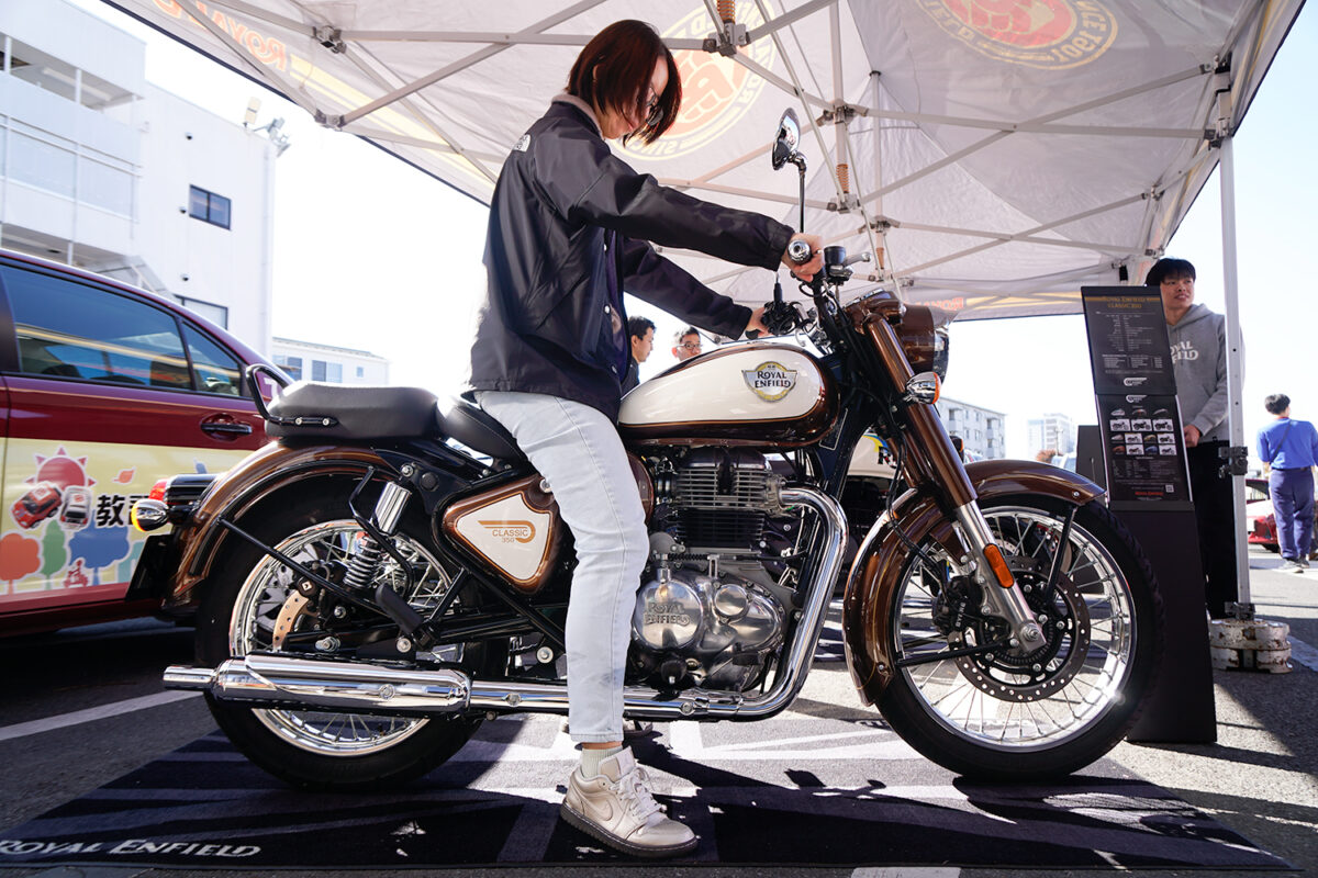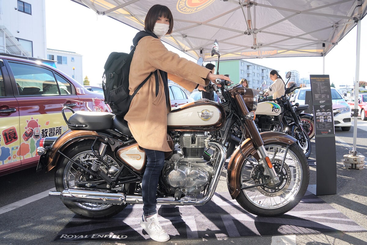 今までブランド名も知らなかったというロイヤルエンフィールドだが、「形が好き! カッコいい」との跨り体験に参加してくれた。