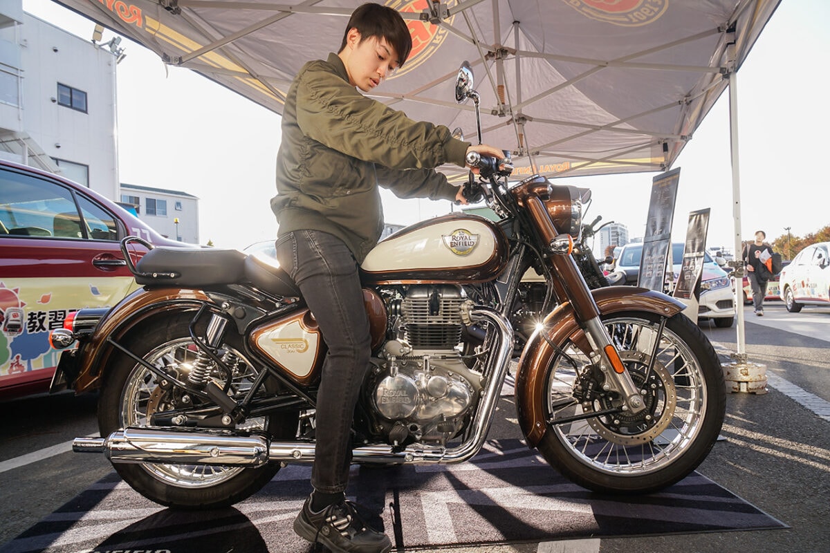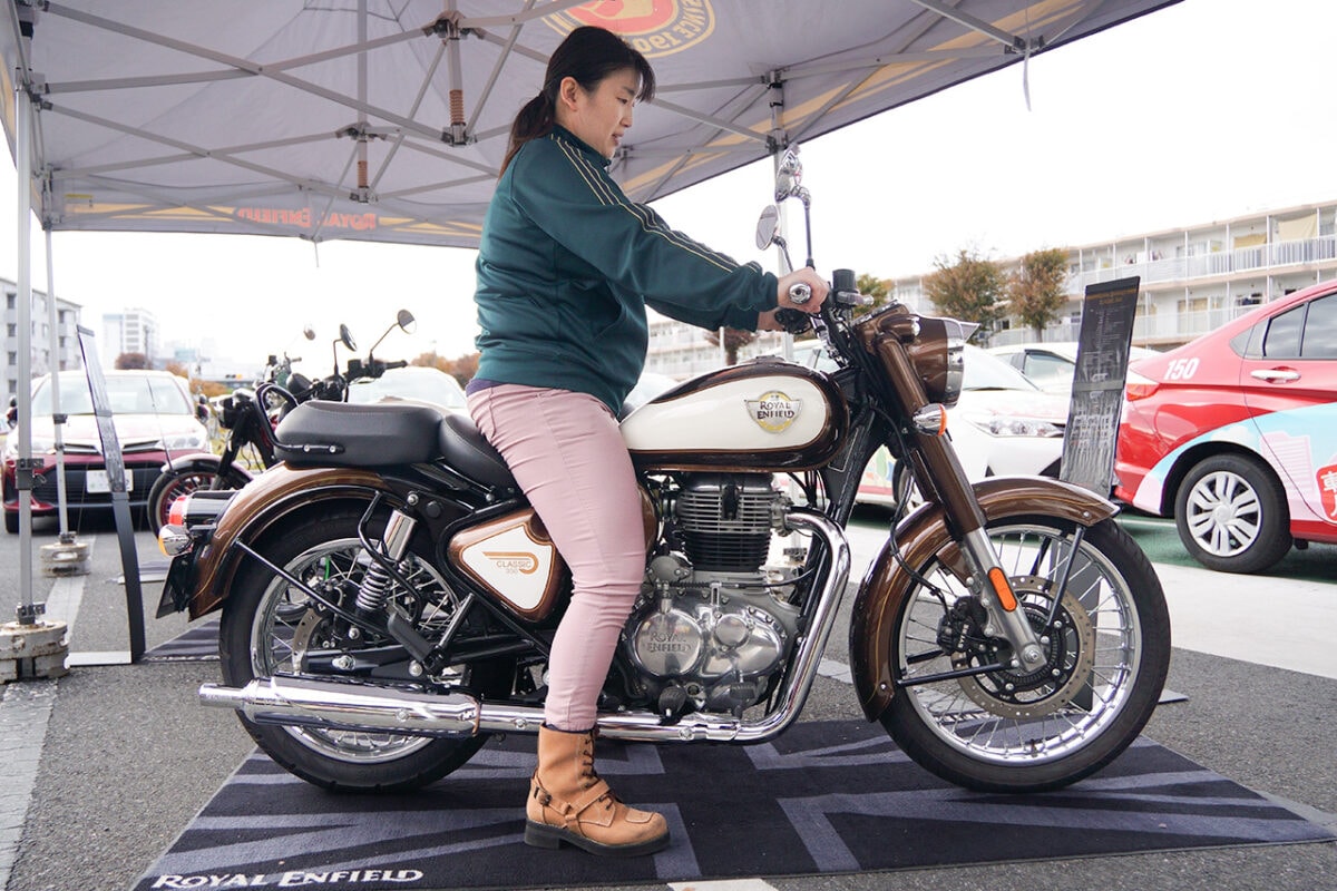 クラシカルなモデルが好きなのでカワサキのW800などを愛車候補に考えているそうだが、今回の跨りイベントでロイヤルエンフィールドと出会い、レトロかつ独特なデザインに興味津々だった。