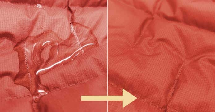表地に水を垂らし5分放置したあと、払い落としてみると……水は染み込まず、中わたも濡れていません。これなら湿った雪に降られても、浸水によるダウンの保温性能の低下を抑えられそうです。